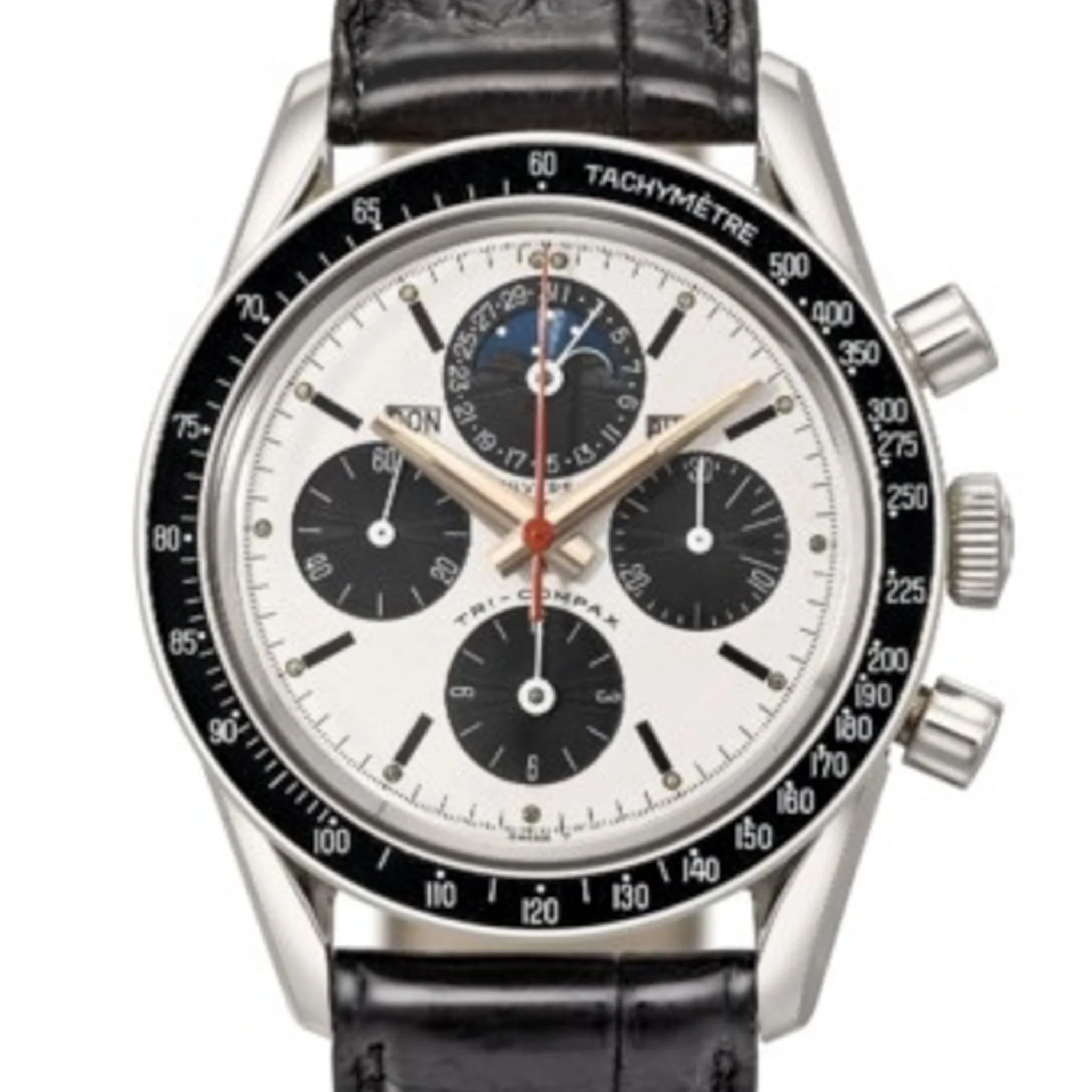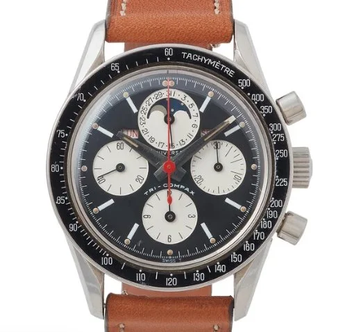 The common reference known as the “Eric Clapton” Tri-Compax. Seen with both red or blue seconds chronograph seconds hands. Some earlier serials share the same smaller pushers as the 222102/1, but most are seen with the large pushers.